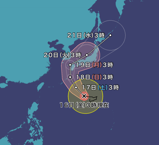 と、なってましたが、今朝の予報では進路予報は昨日よりも日本海側にずれてスピードも遅くなっています。