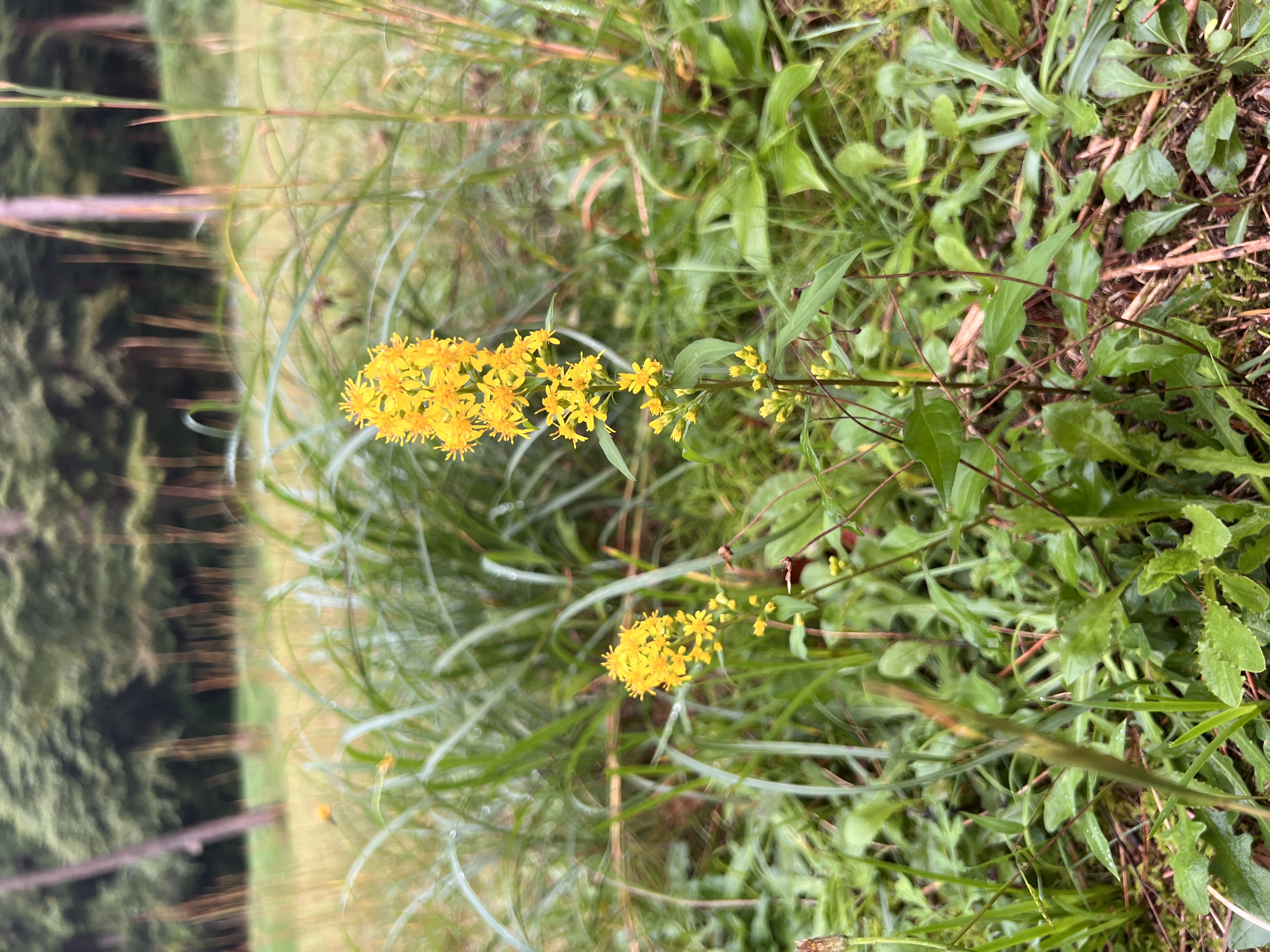 黄色く輝く花は アキノキリンソウ(秋の麒麟草)。