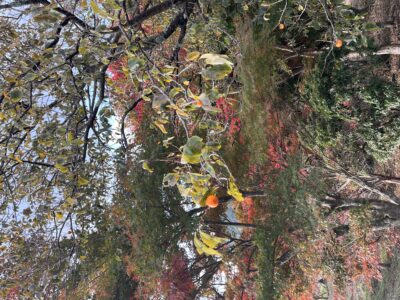 真紅のもみじ、透けるような橙色のカエデ、そして葉を落とし始めた柿の木には、小さなオレンジの実がひっそり残り、季節の移ろいをそっと教えてくれます。