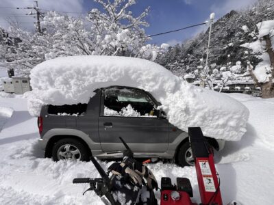 一晩で一面真っ白に! 奇しくも昨年と同じ2月8日に、まとまった雪が降りました。 愛車もすっぽり雪に包まれ、まだまだ冬本番といった景色ですが……。