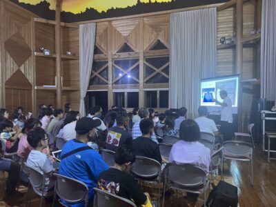 まずは屋内でのレクチャーからスタート。星座や天体に関する基礎知識を、プロジェクターを使いながらわかりやすく解説しました。お子さまから大人まで熱心に耳を傾けてくださり、とても充実した学びの時間となりました。