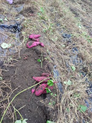畑の土を掘り起こすと、鮮やかな赤紫色のサツマイモが顔を出しました。