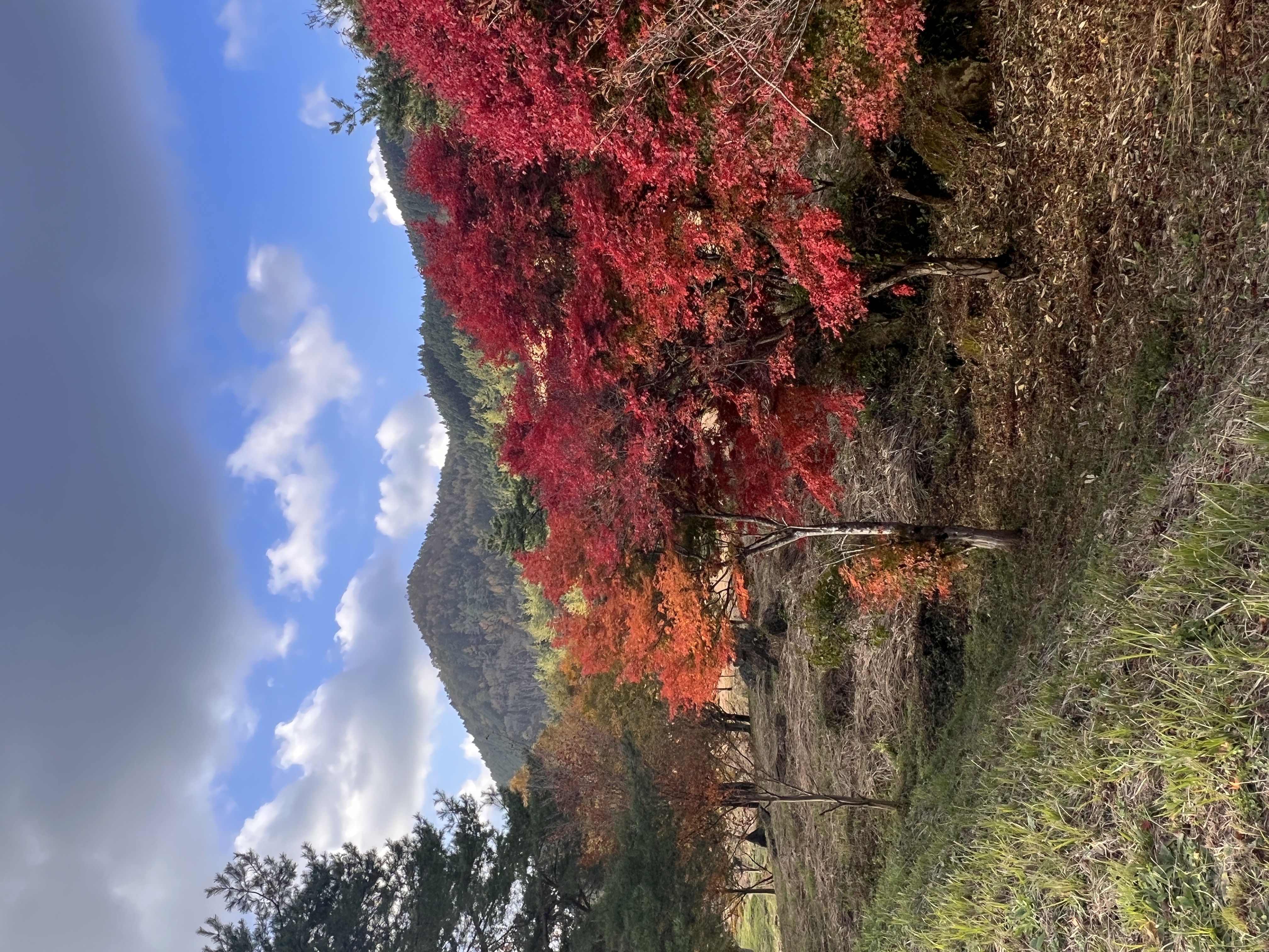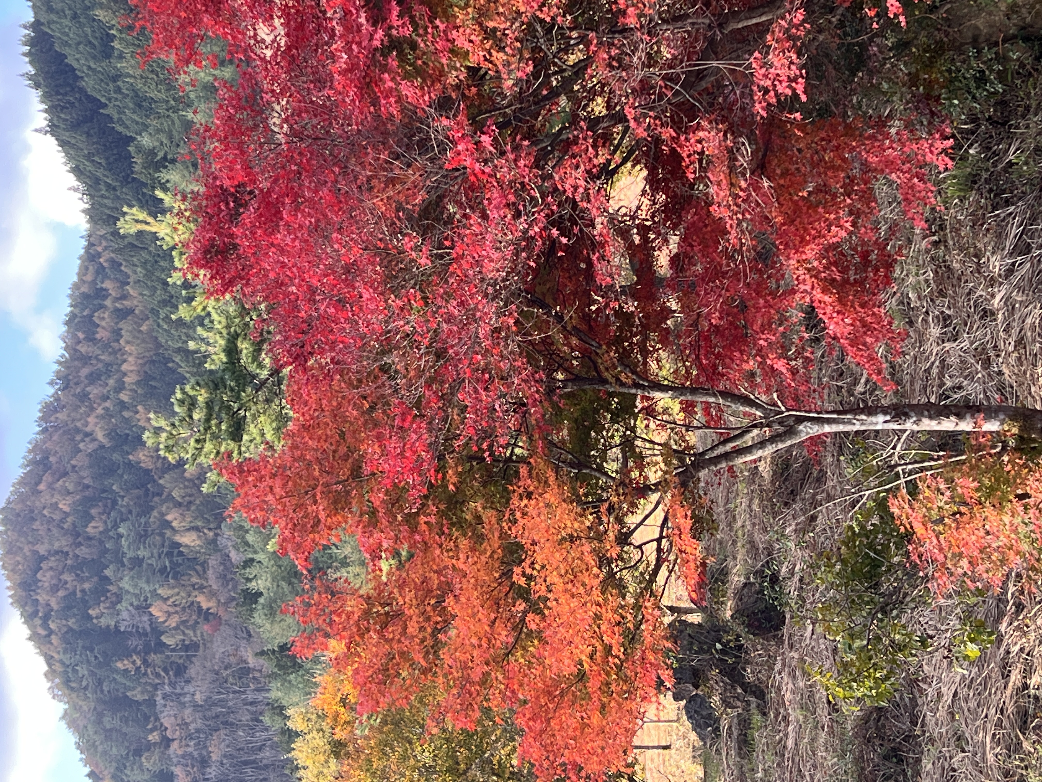 真紅のもみじ、透けるような橙色のカエデ、そして葉を落とし始めた柿の木には、小さなオレンジの実がひっそり残り、季節の移ろいをそっと教えてくれます。